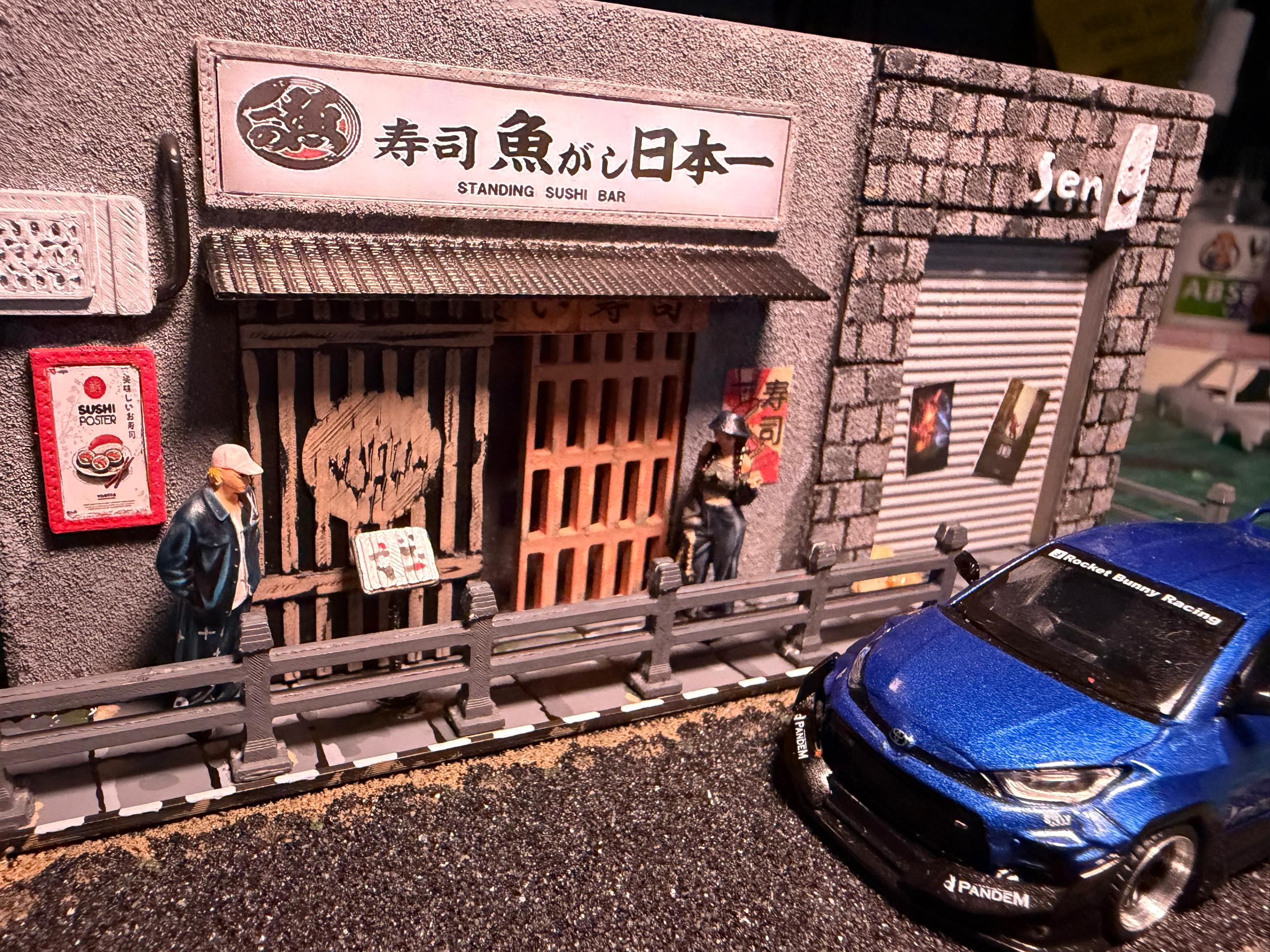 A handcrafted Japanese street miniature featuring a classic sushi bar scene.