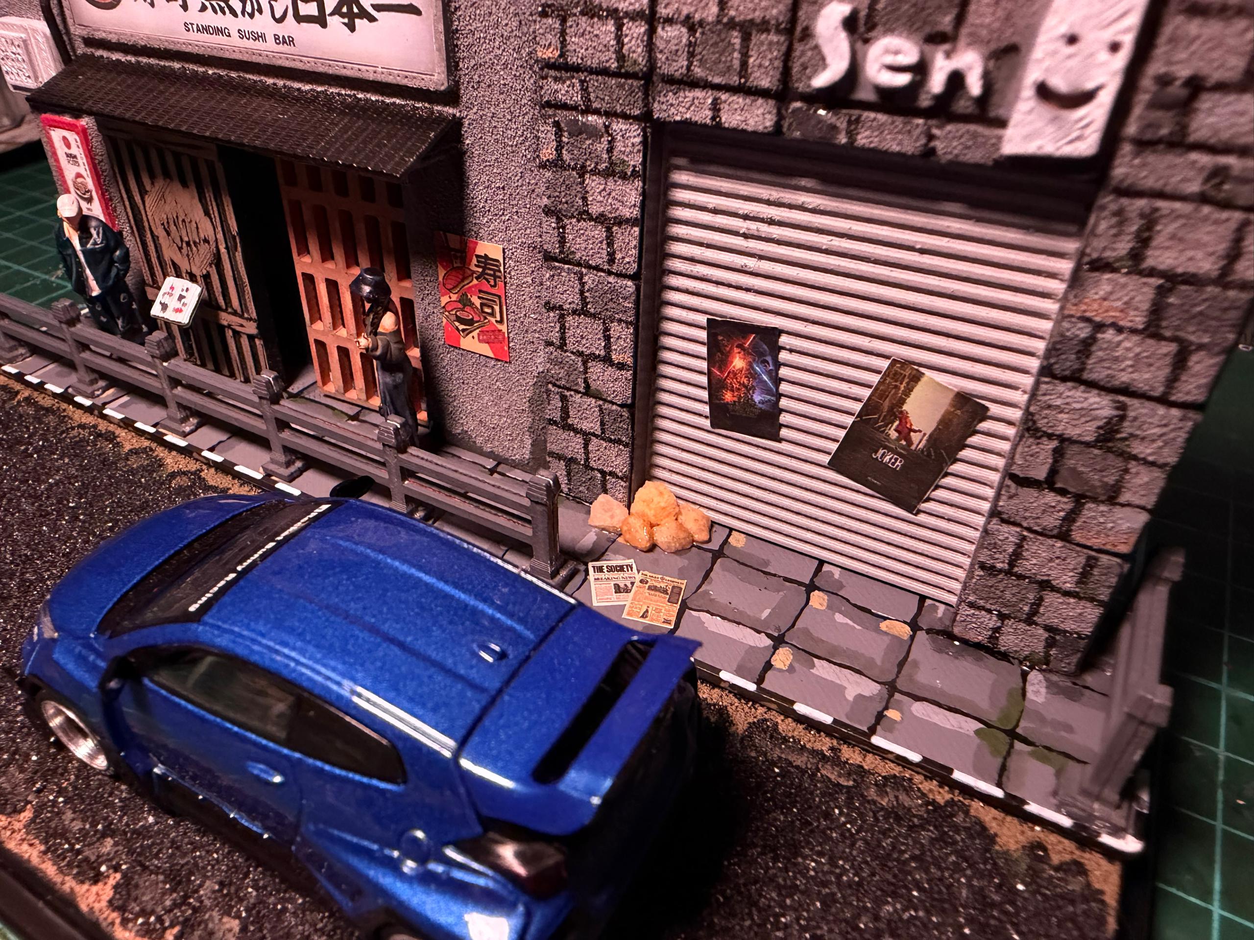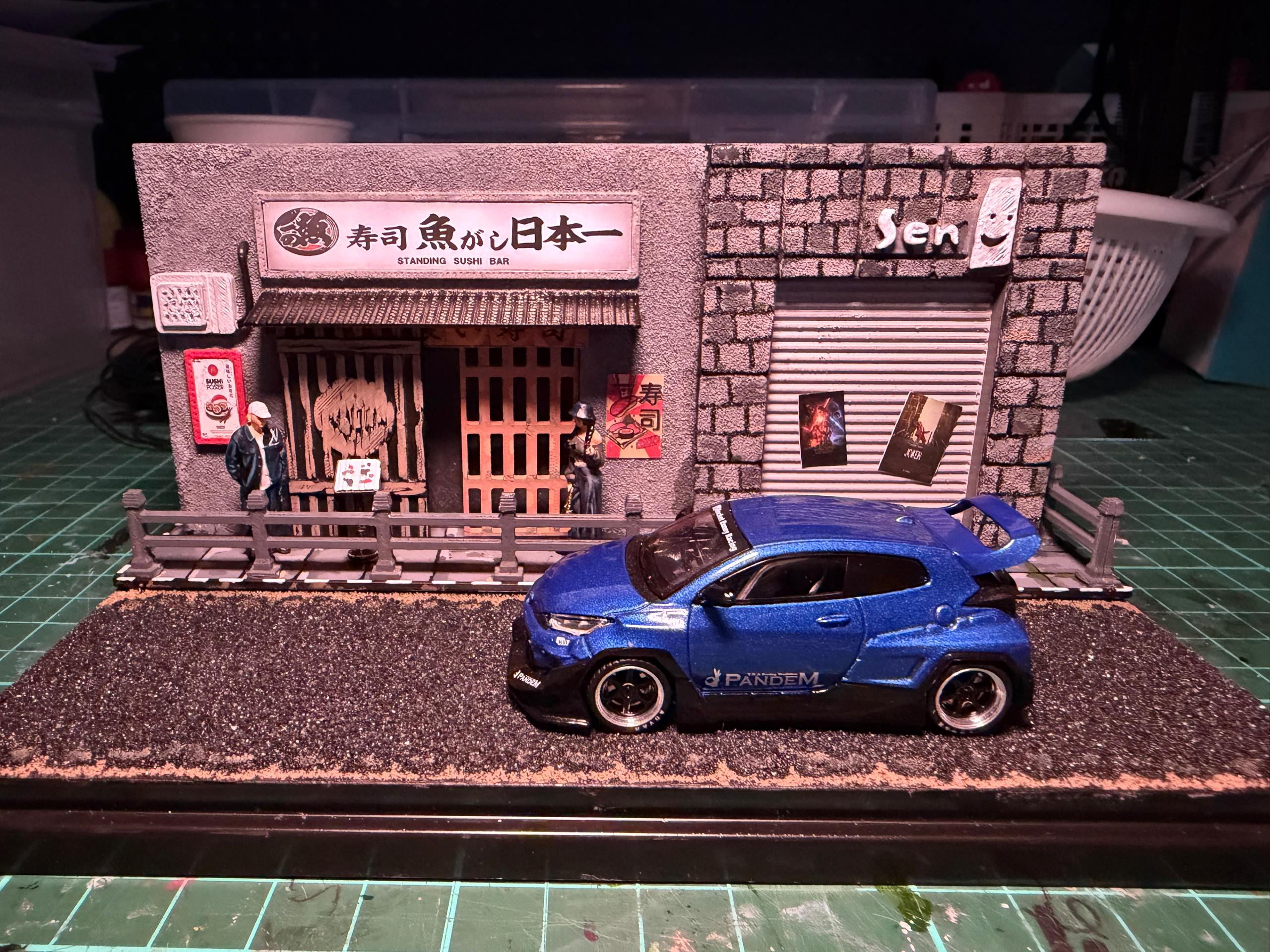 This handcrafted miniature diorama captures the charm of a quiet Japanese street, centered around a classic standing sushi bar.From the textured concrete walls to the wooden sliding doors, every detail is carefully recreated to reflect the authentic atmosphere of a late-night alley in Japan. The subtle lighting, signboards, and street elements add depth and storytelling, making it more than just a display — it’s a scene.